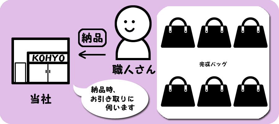 発注仕様書の通りにバッグを制作していただき、当社に完成のご連絡をいただきましたら、取りに伺わせていただきます。